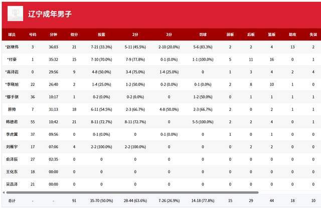 辽宁队尽管砍下了91分,投篮命中率50%,但外线手感不佳,26投仅7中,命中率只有26.9%。还不如天津队25投8中。